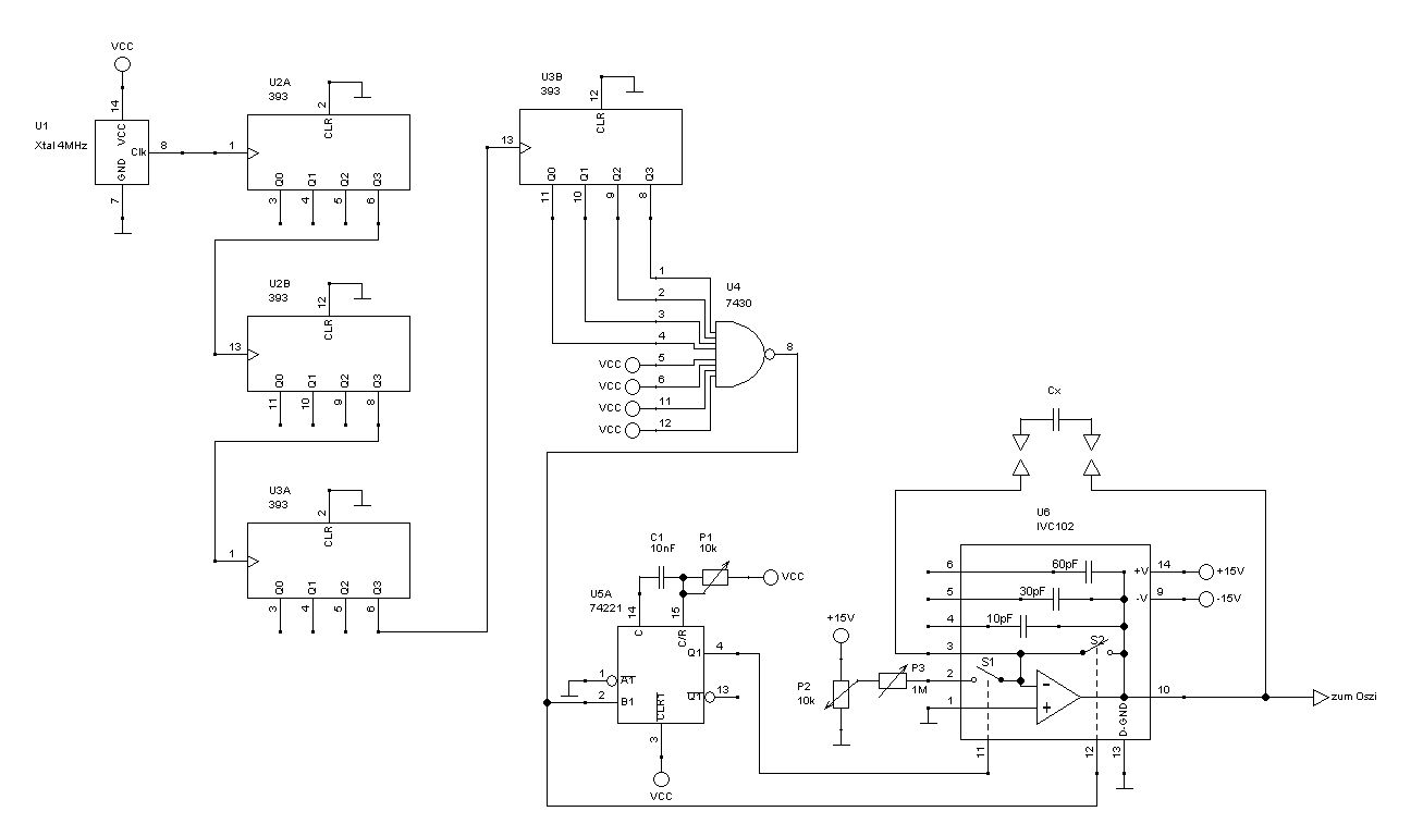 ich habe ja auch ein RLC-Messgerät vom blauen 'C', aber die unteren Messbereiche sind zu gross und ausserdem ungenau. Seit ein paar Wochen zeigt mir jetzt auch noch der L-Bereich einen Schmarrn an. Das Gerät, das Rainer und Dietmar hat scheint ja sehr gut zu sein. Vielleicht lege ich mir auch mal so ein Teil zu. Im Moment verwende ich für die C-Messungen (<=10pF) meinen Eigenbau. Die Bedienung ist allerdings etwas umständlich, da 1* sich ja auf 63 Prozent (bei C laden) bezieht. Ich muss in diesem Fall einmal den Ausgang (Min-Max) des Integrators ohne C messen. Dann setze ich den zweiten Cursor auf 63 Prozent des Pegels. Wenn ich jetzt ein C messen will muss ich die Zeit des 74221 soweit ändern, bis ich mit dem zweiten Cursor wieder die 63 Prozent Linie erreiche. Die Zeit ist dann 1. Zugegeben, das ist etwas umständlich aber doch sehr genau und @Bernd reproduzierbar. Ich habe allerdings ein Problem mit der Anzeige bei Messungen <9pF. Der Integrator scheint hier ein Problem mit der Settling-Zeit zu haben. Das macht aber nichts, da ich den Pegel erst messe, wenn er stabil ist. Die Schaltung im Anhang ist für C's mit kleiner Kapazität augelegt. Für grössere Kapazitäten kann man sie aber anpassen. Da ich hier mit relativ kleinen Messfrequenzen arbeite ist die Drahtlänge zum zu messenden Kondensator nicht kritisch. Bei 1pF bekomme ich hier eine Pulsbreite von 1us.