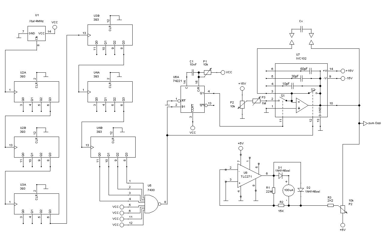 Was die Kapazitätsmessung angeht, da habe ich meine Schaltung etwas verbessert. Für die Anzeige des Pegels bei 63 Prozent verwende ich jetzt alternativ zum Oszi als Anzeige ein kleines Drehspulinstrument, das auf Mittelstellung justiert ist. Die Trickschaltung mit den Dioden verhindert hierbei, dass der Strom zu gross wird. Man muss die Dioden allerdings selektieren.