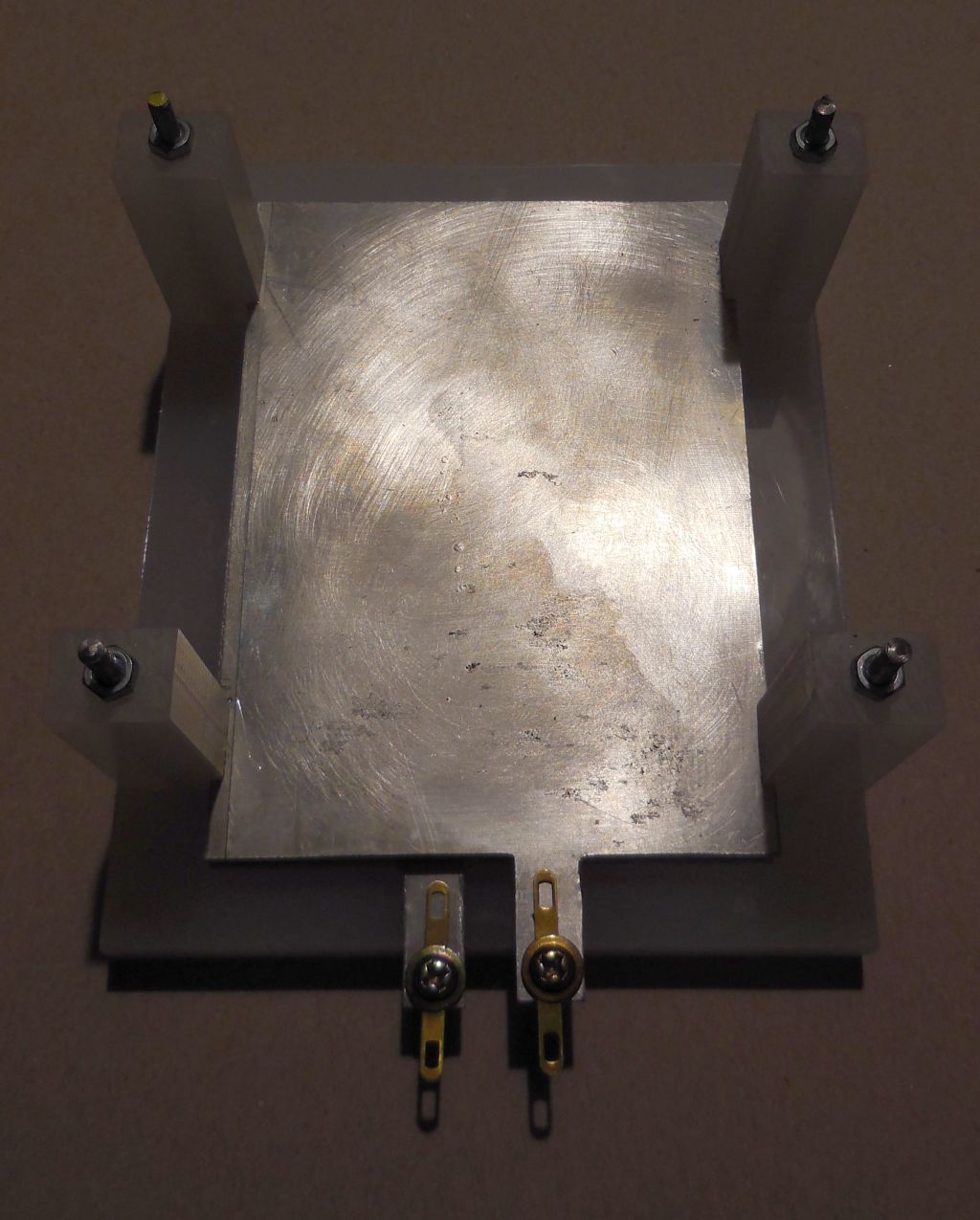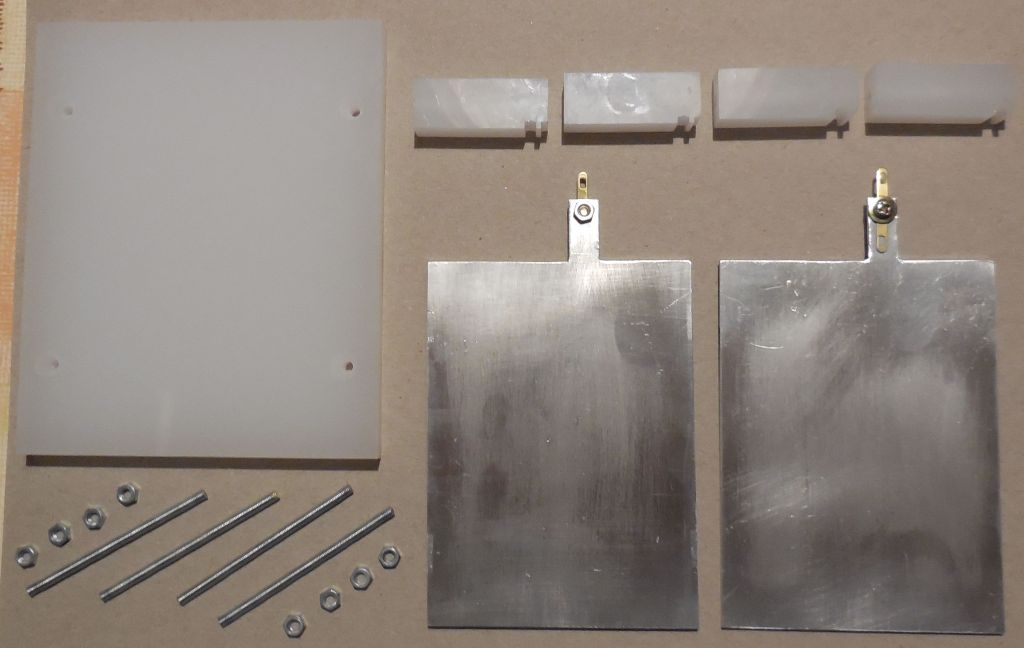 Die Kapazität habe ich mir am Wochenende gebaut. Sie sieht einfach aus, aber sie war doch sehr aufwendig. Um 50pF zu bekommen, musste der Abstand der beiden Platten (in meinem Fall) genau 1,37mm betragen.