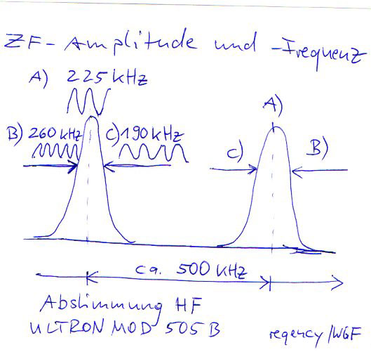 Zwei Maxima beim Durchstimmen im Abstand von ungefähr 500 kHz. Die ZF Frequenz variiert dabei stark. Im folgenden Bild ist das dargestellt, Mittenfrequenz der Maxima und die Frequenzangaben in Höhe von rund 70% (-3dB). Die äußeren Flanken gehen bis ca 400 kHz, dann wird das Signal-Rauschverhältnis zu klein.
