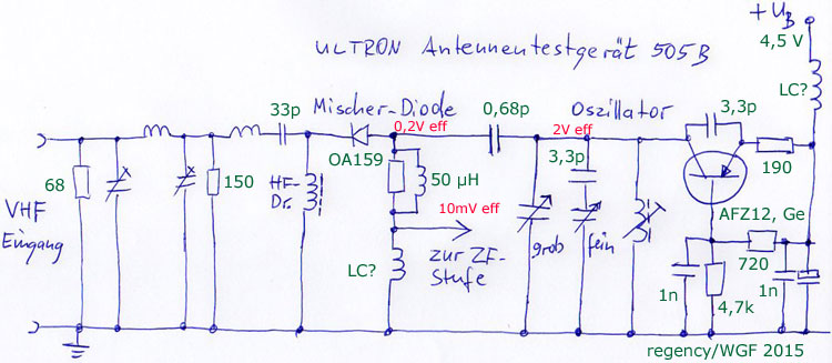 Die Eingangsstufe hat eine Art Doppel-Pi Filter. Der ist wie es den Anschein hat über ein Diode an eine selbstschwingende Oszillator- und Mischstufe gekoppelt. Genaueres wird die Schaltung zeigen.