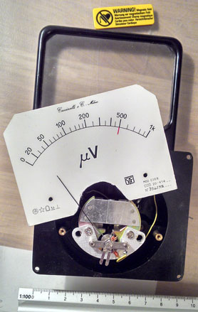 Innenwiderstand: 120 Ohm. Zum Vergleich habe ich ein empfindliches Drehspulmessgerät (Z 4313) mit ähnlich großer Anzeige herangezogen: 60µA/75mV entspricht Innenwiderstand 1,25 kOhm, das 10fache. Damit ließe sich (Abgleich vorausgesetzt) das Gerät bestimmungsgemäß betreiben. Das eingebaute Messwerk selbst ist also zu unempfindlich.