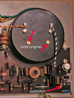 Hat ein Vorbesitzer das ausgetauscht? Erst jetzt fallen mir Anzeichen dafür auf: Die original Skalenscheibe ist bei genauer Betrachtung etwas unsauber als Halbkreis unten ausgespart. Die Rückseite weist dort Kratzer auf. Beim Ausbauen des Messwerks ist zu sehen, dass zusätzliche Bohrungen hinten für die Befestigung angebracht wurden. Hier wurde sauber gearbeitet, das fällt kaum auf. In einem Bild von der Rückseite der Platine vom Nachfolger-Gerät 505C im RMOrg, das das gleiche Messwerk haben dürfte, gibt es diese beiden Schrauben nicht. Jetzt wird klar: es ist nicht das original Messwerk.