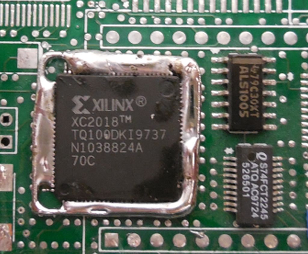 @Walter Das hat mir jetzt keine Ruhe gelassen und ich habe auch mal probiert einen Xilinx auszulöten. Meine Vorgehensweise sieht man in den folgenden Bildern. Die Platine ist unbeschädigt geblieben, aber ob der Xilinx das überlebt hat wage ich zu bezweifeln. Damit mir das Lötzinn nicht wegfliesst habe ich mir eine Büroklammer zurechtgebogen. Ausserdem verteilt sich die Wärme besser. Naja, das Löt-Ergebnis ist nicht gerade schön, aber selten.