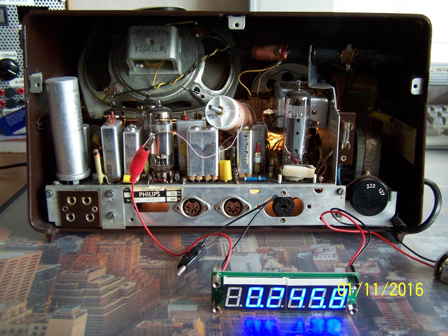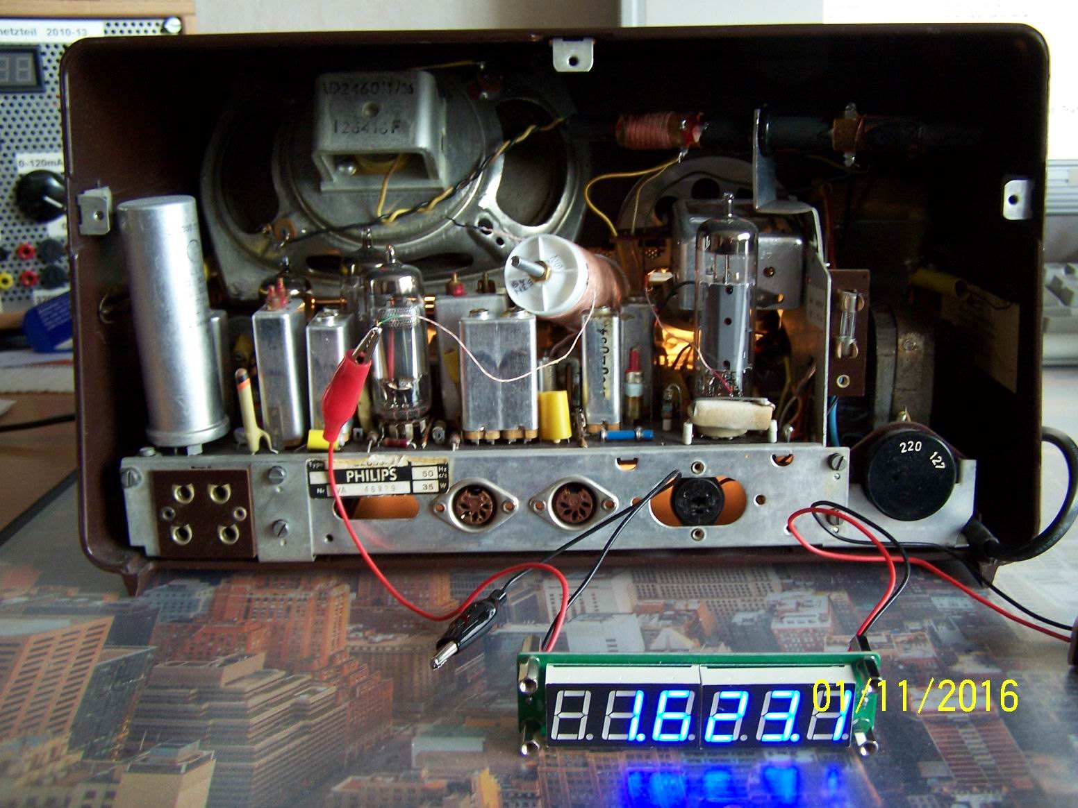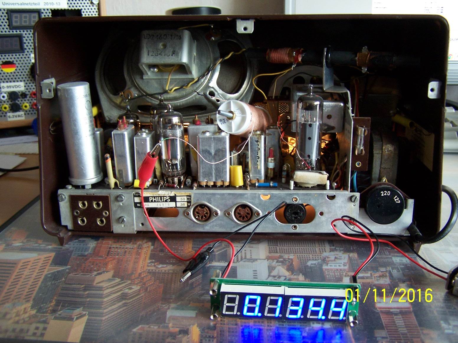 Mann nehme eine Philetta, einen Frequenzzähler mit 9V-Batterie und eine selbstgewickelte MW-Spule. Diese Spule habe ich zuerst mit beiden Anschlüssen an den Zähler angeschlossen. (Ein Anschluß reicht auch!) Danach suchte ich im Geräteinneren eine Anzeige, bei eingestellter Frequenz von 1000KHz erschien 1460KHz. Also programmierte ich diese Zwischenfrequenz von 460KHz ab, danach erschien sofort die richtige Anzeige. Nun probierte ich auf LW/MW&KW jeweils den Bandanfang und das Bandende aus.