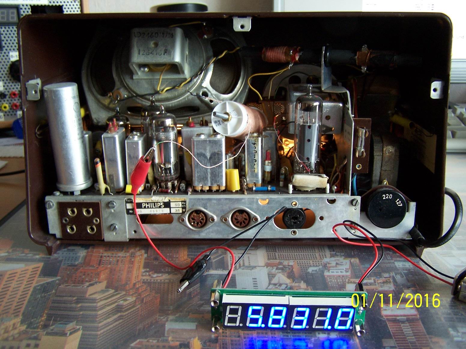 Sollte man kein Oszi oder Frequenzzaehler zur Hand haben, dafuer aber einen durchgehenden Weltempfaenger, koennen Sie mit dieser Stoerstrahlung leicht die Funktion des Oszillators im Reparaturgeraet feststellen. Auch SSB Empfang ist so, mit zwei Radios, realisierbar.