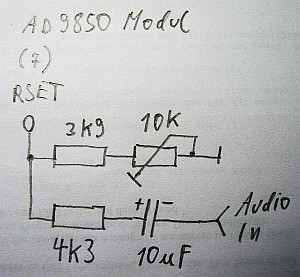 Zurück zur AM-Modulation: Ingos Vorschlag habe ich mit Erfolg ausprobiert, zumal ich auf die 100 bestellten 2N7000 zwei Monate warten muss. Alles auf meiner Seite dokumentiert. Leider liegt am Pin7 meines Moduls ein anderes Signal an. Deshalb musste ich direkt einen Draht an den Pin 12 des DDS-ICs löten. War kein Problem, da man vorher noch den Widerstand R6 auslöten muss und dann hat man ein recht großes Lötpad für das Anlöten des Drahtes.