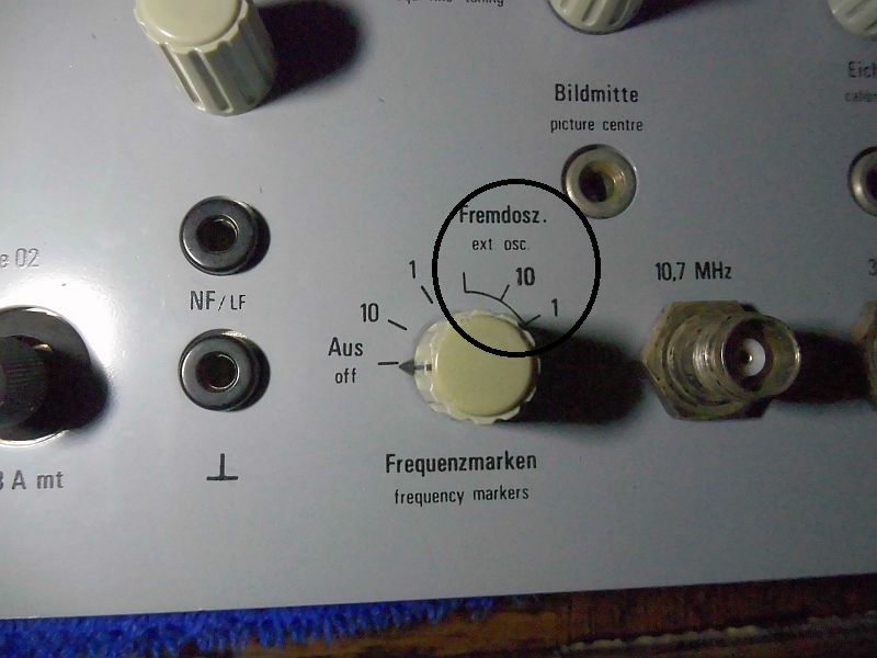 Neu hinzugekommen ist die Umschaltmöglichkeit (Erweiterung des Frequenzmarkenwählers) auf ein extern eingespeistes Oszillatorsignal an Buchse "1. Oszillator". Ursprünglich gedacht als Kontrollausgang für den 1. Oszillator im Einschub.