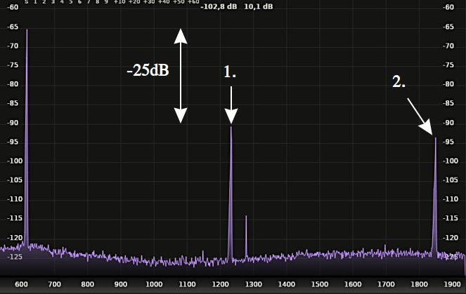 Die Versorgungsspanung ist die gleiche geblieben - siehe Schaltbild weiter oben. Ich verwende für solche Zwecke gerne kleine LiPo Akkus, die vom Modellbau vorhanden sind. Den Ausschlag, etwas mehr Aufwand zu treiben, war die bessere Oberwellendämpfung. Bei der einfachen Schaltung sah das etwa so aus: