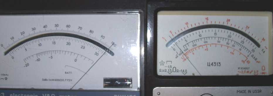 Das Philips-Messgerät hab ich auf einen Vollauschlag von 1 Megohm gestellt. Das rechte Multimeter auf den Bereich "1 kOhm". Beide Skalen erstrecken sich also über 1000 kOhm. Bei dem Multimeter gilt die dritte Skala von oben, beim Philips die obere Skala.