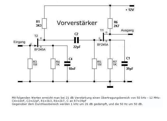 Mit folgenden Werten erreicht man bei 21 dB Verstärkung einen Übertragungsbereich von 50 kHz - 12 MHz: C4=10nF, C2=22pF, R1=3k3, R6=2k7, C an R7=39pF Gegenüber dem Durchlassbereich werden 1 kHz um 26 dB gedämpft, und die 50 Hz um 50 dB.