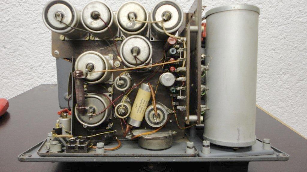 Hier 4 Bilder meines eigenen Gerätes mit dem ersetzten Netztrafo und vielen fehlenden Kondensatoren auf der Chassis-Unterseite. (Es fehlen die Kondensatoren mit den Teilenummern: C17, C18 C20, C21, C22 und C23) Das Poti für die Ausgangsspannungsregelung wurde übrigens auch ersetzt.