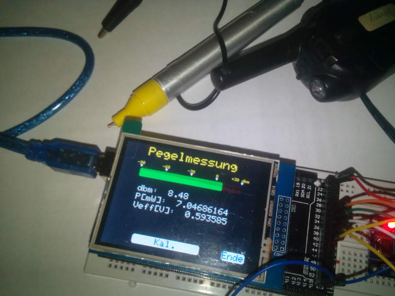 Jetzt stellt sich eine Frage. AD8307 fest als Eingangs-IC des Messgerätes nutzen, damit braucht man auch nur einen Satz an Kalibrierungsdaten im MEGA2560 oder doch flexibel mit mehreren Messköpfen arbeiten? Mehrere Messköpfe haben natürlich Vorteile. Dann muss der MEGA2560 aber auch mehrere Kalibrierungsdatensätze verwalten können. Wo speichern? Das TFT Display hat auf der Rückseite noch einen SD-Kartenslot, allerdings soll dieser laut Datenblatt des Displays nur mit dem UNO R3 funktionieren, nicht jedoch mit dem MEGA2560. Kann man das Problem irgendwie umgehen? Vielleicht mit soetwas wie einem Software-UART? Die nächste Frage, wie unterscheidet das Messgerät die Messköpfe? Vielleicht ginge es automatisch mit einer Binär-kodierten Messkopfnummer, die 2 bis 3 Eingänge des MEGA2560 auf einen definierten Pegel setzt. Als Anschluß könnte dann eine 5- oder 8- polige DIN-Buchse dienen, es wird ja keine HF sondern nur noch eine Gleichspannung übertragen. Wie würdet Ihr das lösen?