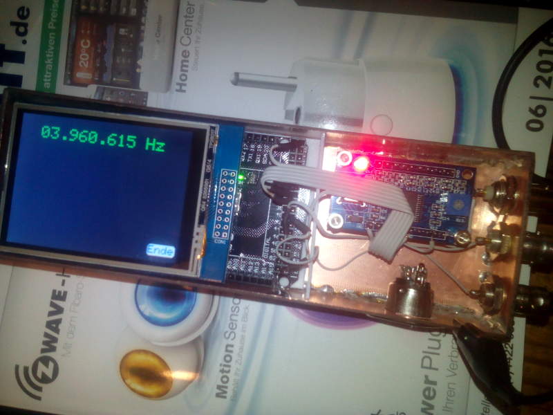 heute habe ich weitergebastelt und mich vom Steckbrett getrennt. Der DDS erhielt eine Pufferstufe mit zwei 2N3904 in Sandwichtechnik. Softwaretechnisch habe ich noch einen Frequenzzähler implementiert, es sind ja noch genügend Pins frei. Dazu gab es noch eine Vorverstärker der ab 50mV anschlägt. In der Endfassung werde ich die Verbindungen noch richtig HF tauglich ausgestalten und die Steckleiste vom MEGA2560 entfernen, sowie die Steuerleitungenbindungen direkt mit der Platine verbinden.
