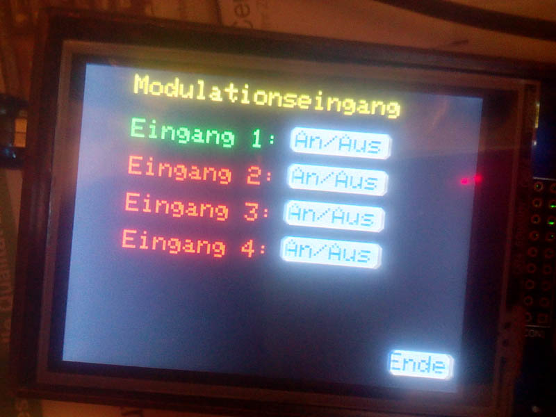 es wurde weitergebastelt. Um die verschiedenen Modulationskanaele (4 Stueck an der Zahl) auf einen physischen Modulationsanschluss am DDS-Modul herunterzubrechen, habe ich einen Analogschalter 4066 verwendet. Die Ausgaenge der 4 Schalter wurden zusammengefasst, die einzelnen Schaltimpulse kommen von noch freien Anschluessen des MEGA2560. Die logische Abbildung erfolgt dann einfach im Programm.