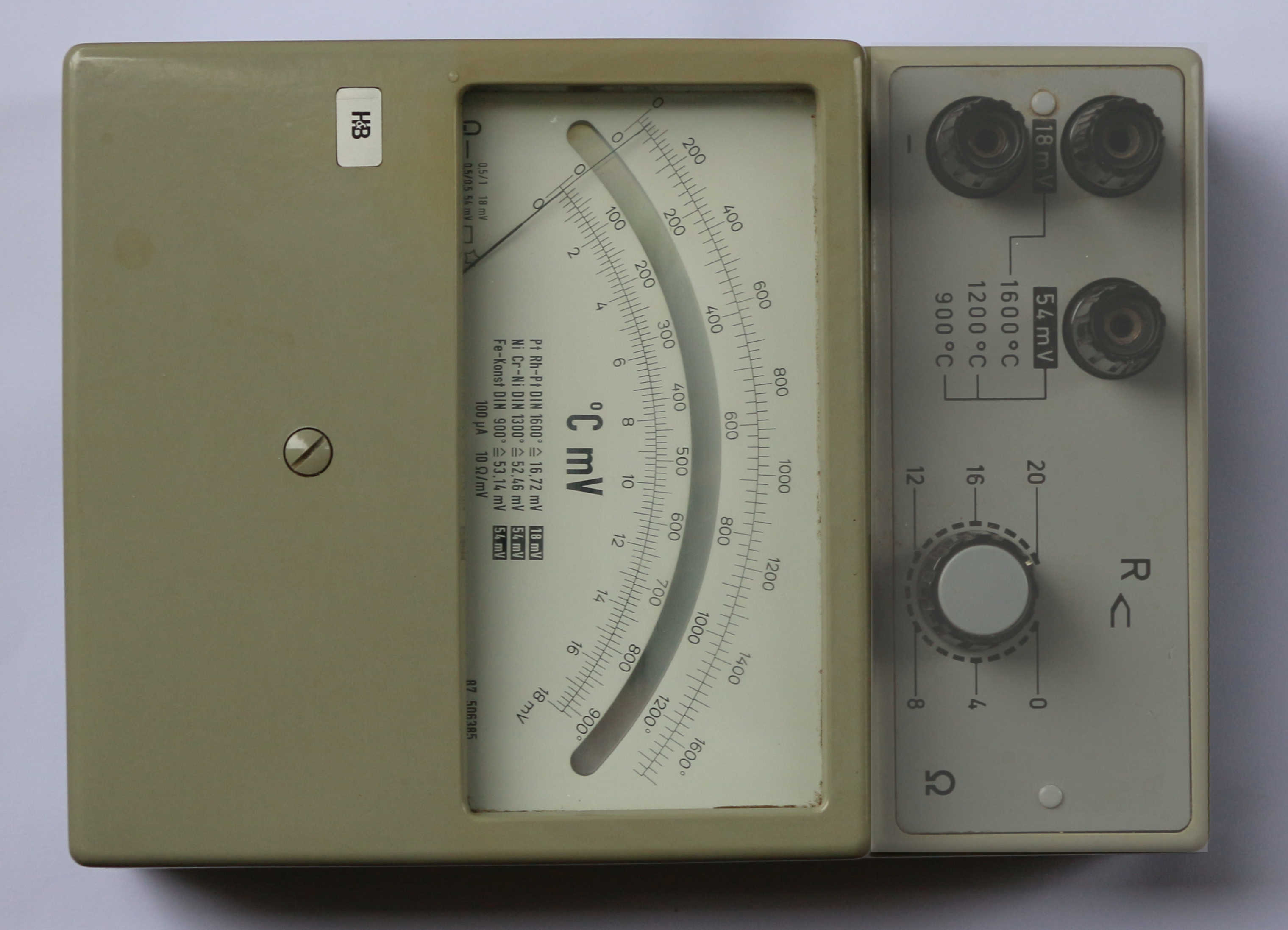 Moin, Vor Kurzem bekam ich aus der Auflösung der Physiksammlung einer Schule dieses Meßgerät von Hartmann & Braun. Es ist ein Temperaturanzeigegerät für Thermoelemente. Die Meßbereiche sind 900°C für Fe-Ko-, 1200 °C für Ni-NiCr- und 1600 °C für Pt-PtRh-Thermoelemente Eine Nullpunkt-Kompensation ist nicht vorgesehen. Nur für den Thermoelement-Widerstand ist eine Korrektur vorhanden. Bei "normaler" Umgebungstemperaturen kann der Nullpunkt auf 20°C verschoben werden, um die Anzeige "richtig" zu haben.