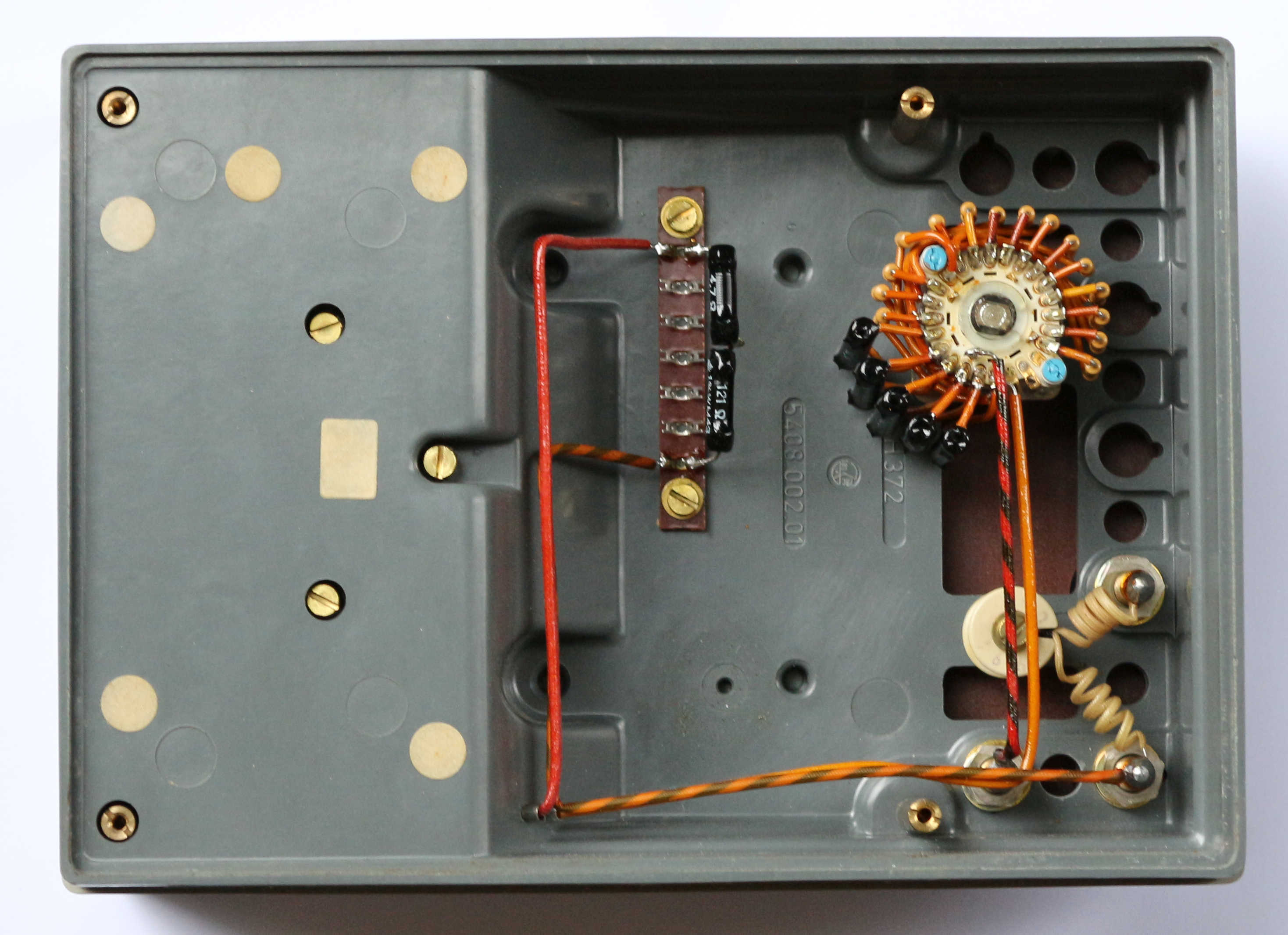 Oben seht ihr die fetten Vorwiderstände für die höheren Leistungsklassen. Deswegen sind in der Bodenabdeckung auch Entlüftungslöcher vorhanden um die Wärme abzuführen.