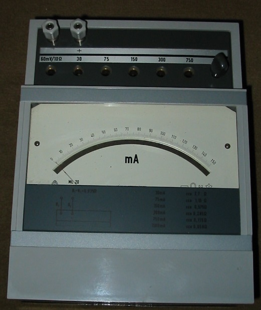 Meine Referenz für Strommessungen ist -noch immer- das tschechische Laborgerät ML-20 von Metra Blansko mit den Messbereichen 30, 75, 150, 300, 750 und 1500mA aus dem Jahr 1973. Ohne Shuntwiderstände hat das Drehspulinstrument der Klasse 0,2% (!) einen Vollausschlag von 60mV bei 10 Ohm Innenwiderstand.
