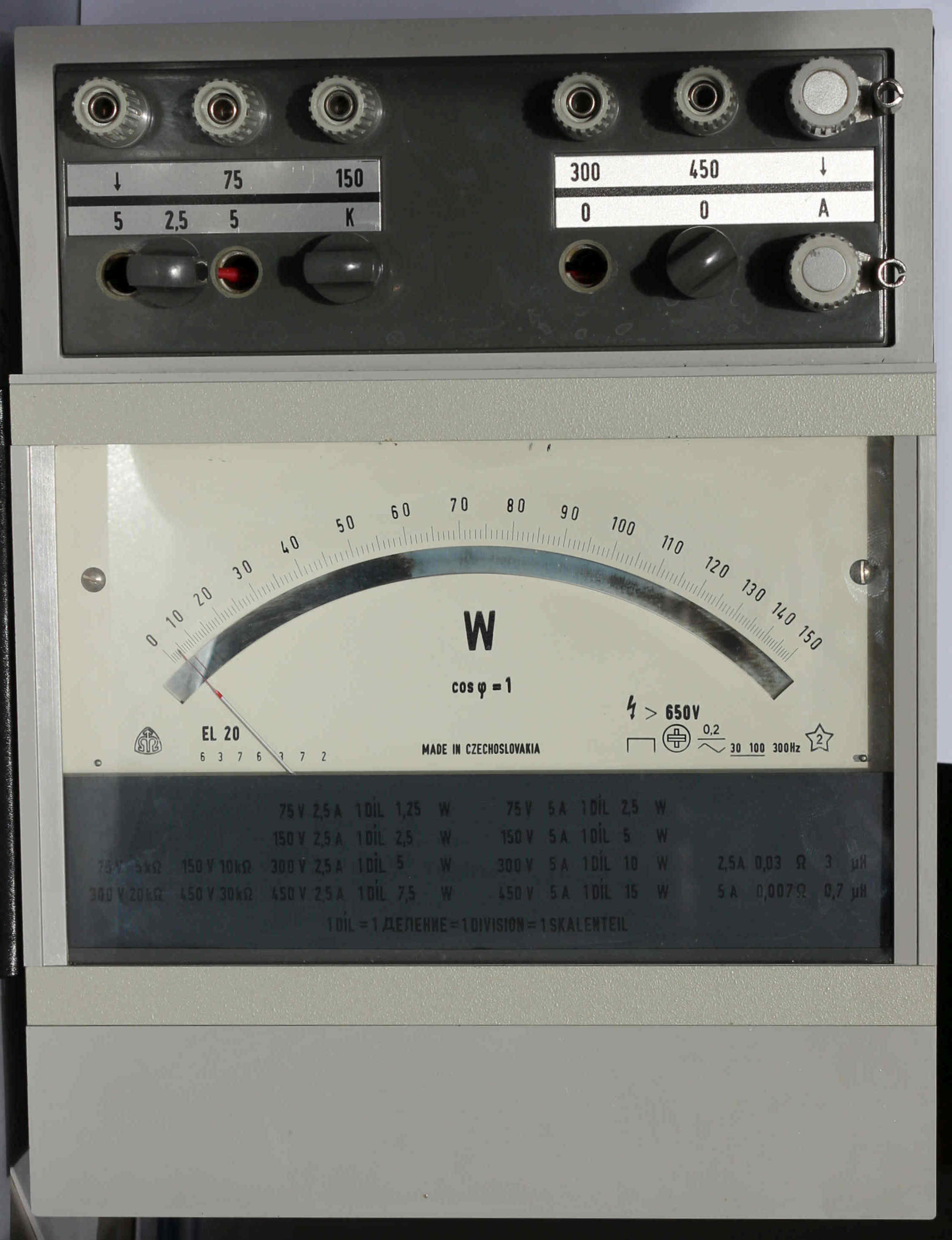 Moin Walter, danke für Deine Antwort. Nun weiß ich auch, wer mein Wattmeter hergestellt hat. Ich habe vom selben Hersteller ein Wattmeter E 20 mit ebenfalls Klasse 0,2 mit eisenlosem Meßwerk. Die Meßbereicheinstellung ist für mich etwas kryptisch. Daher habe ich es auch noch nie benutzt. Hier ist ein schnell gemachtes Foto davon.