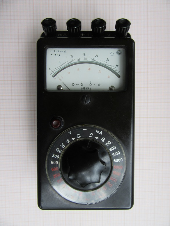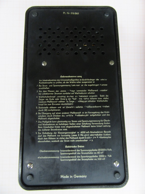 Der Universalmesser (Vielfachmesser) IV von EAW (Einschalten, ausschalten, wegwerfen) wurde Mitte der fünfziger Jahre in Berlin hergestellt. Der Verkaufspreis lag bei 385 Mark, die Daten gehen aus der Beschreibung hervor. Das Herstellerlogo "Made in Germany" wurde erst Anfang der sechziger Jahre durch "Made in GDR" abgelöst. Das Gerät gehört zur Genauigkeitsklasse 1,5 und ist mit einer Spiegelskala ausgestattet. Bei Überlastung sprang der Druckdrehschalter heraus und unterbrach den Stromkreis. Die Einteilung der Messbereiche auf einer dreißiger Skala ist einfach und logisch. Man muss mit Zwei multiplizieren oder durch Zwei dividieren, das war es dann schon. Soweit eine kurze Beschreibung des Multizets.