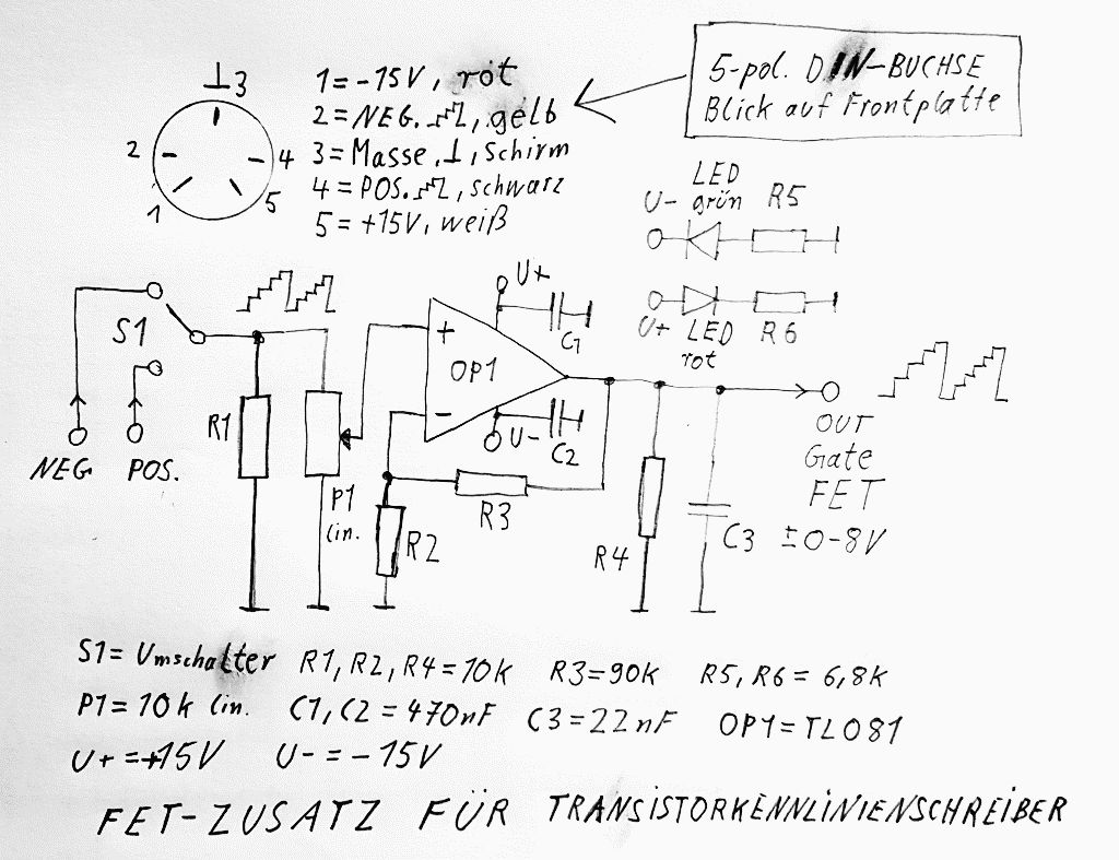 Einfache Sache. Es handelt sich um einen nichtinvertierenden OP mit etwa 10-facher Verstärkerung. R2 und R3 bestimmen den Grad der Gegenkopplung laut Grundschaltung. Mit S1 kann man zwischen dem negativen und positiven Treppensignal umschalten. R1 und P1 bilden zusammen 5 kOhm und machen aus der Stromquelle eine Spannungsquelle, dessen Spannungswert am Schleifer abgegriffen wird und dem nichtinvertierenden OP-Eingang zugeführt wird. Am Ausgang des OP sind noch R4 und C3 geschaltet, damit die Schaltung stabiler läuft und keine wilde Schwingungen beim Messen des FET entstehen können. Der OP muss mit einer negativen und positiven Speisespannung versorgt werden, Diese liegen bereits im Kennlinienschreiber vor. Das ist der ganze Zauber.