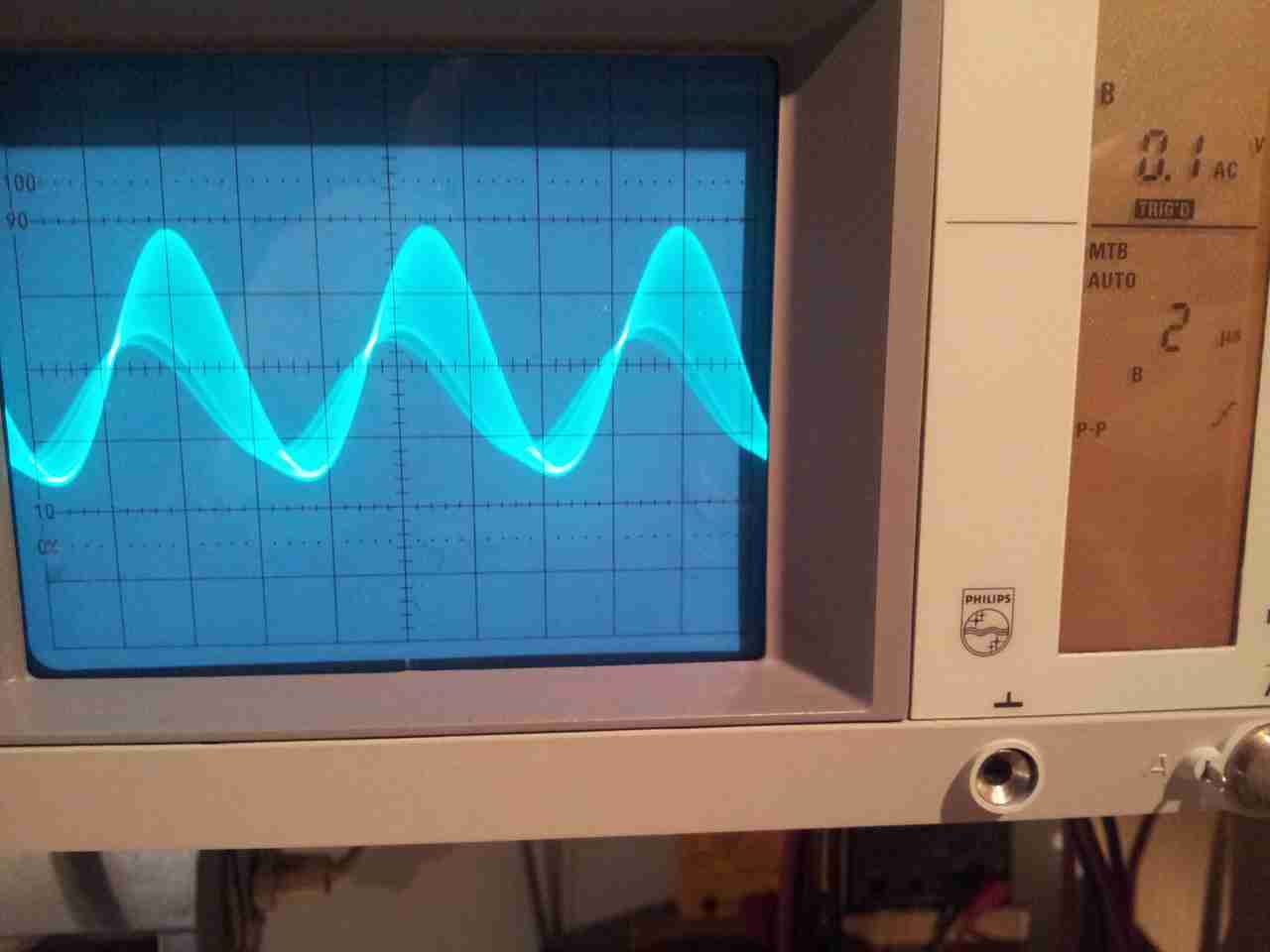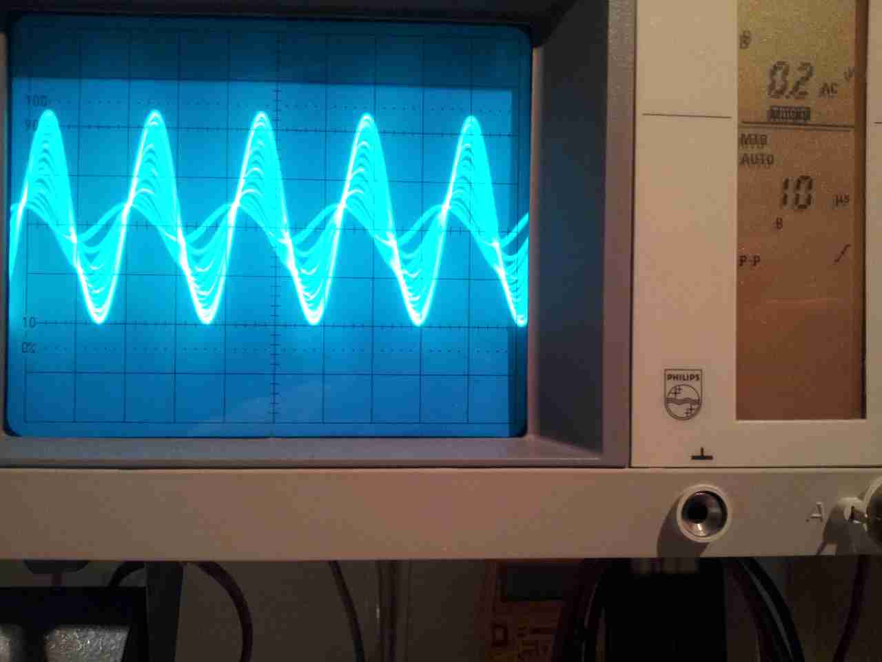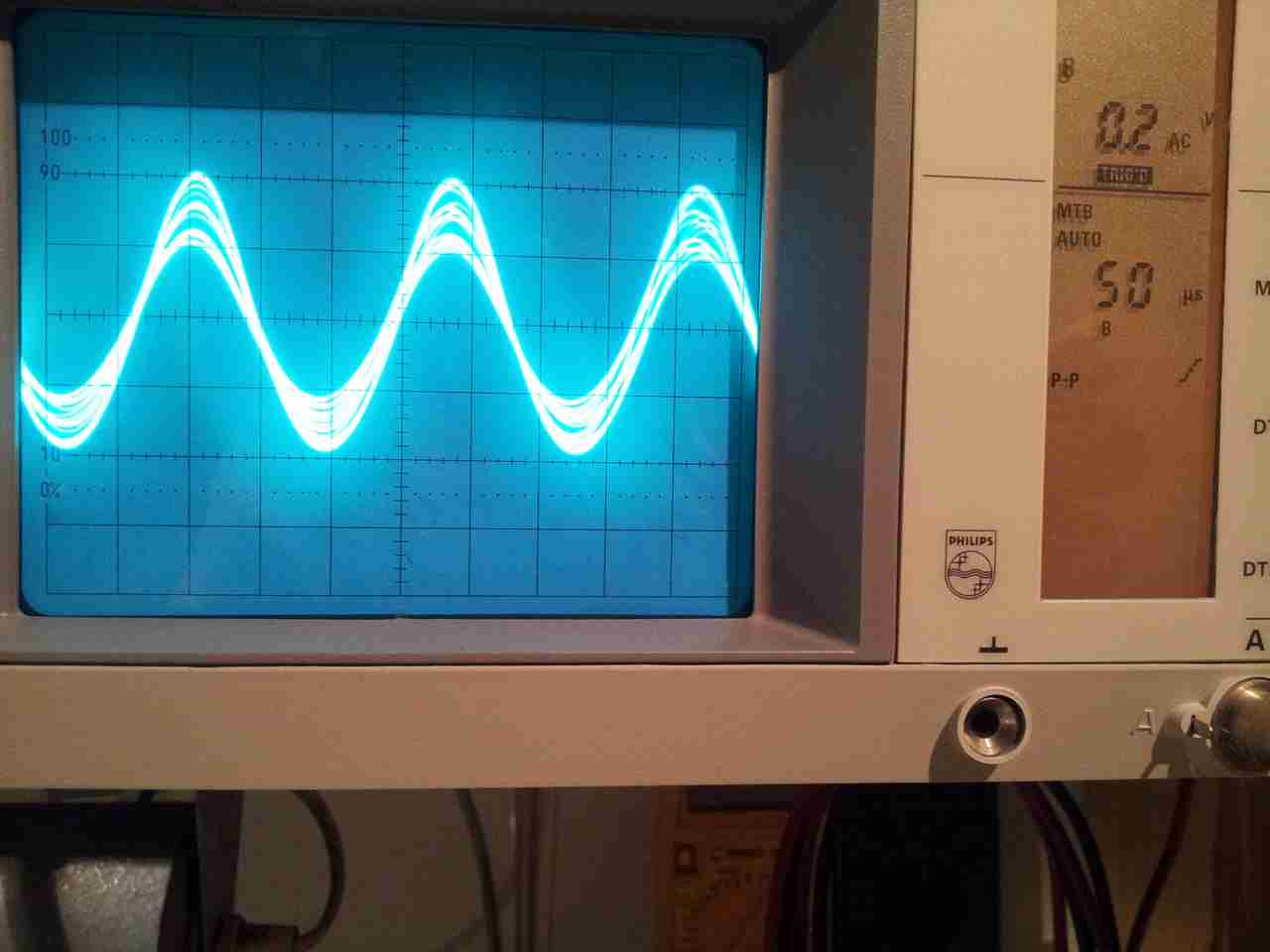 Bei meinem ist dieser Regelvorgang "träge", verstell ich die Frequenz, nimmt die Signalstärker erstmal zu oder auch ab, und wird dann innerhalb einer Sekunde eingeregelt. Daß das eine Sekunde dauert ist ein Hinweis auf Kondensator. Und wäre selbiger weg bzw defekt, dann würde die Diode versuchen so schnell zu sein wie das Signal selber, was zur Folge hätte daß bei jedem Durchlauf des Oszis von links nach rechts die kleine Diode schonwieder ein klein wenig an der Signalstärke geschraubt hat, eiert das nun etwas hin und her kommt die nächste Welle etwas höher oder niedriger an, wobei die vorhergehende per Nachleuchten des Phosphors noch da ist, das Ergebnis sind dann zwei oder drei übereinander...