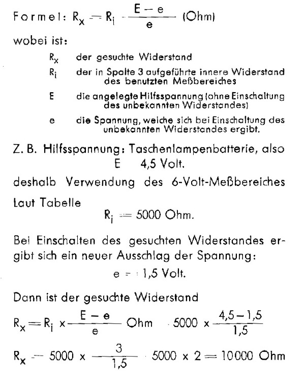 Wie hat man früher, oder auch heute die Größe eines Widerstandes gemessen ohne speziellen Ohmmessbereich im Volt und Amperemeter ? Mit einer Hilfsspannung, so wie ein Ohmmeter auch. Man misst den Spannungsabfall am unbekannten Widerstand. Aber welche Formel braucht man dafür ? Hier ist sie aus Historischer Quelle.