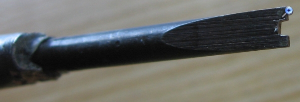 Da braucht man eigentlich nicht viel erklären. Das ist ein Uhrmacherschraubenzieher, in dem ich einst mit einer Schlüsselfeile ein Kerbe eingefeilt habe, damit sich der Schraubenzieher für Schrauben mit unterbrochenen Schlitzen eignet. Die Kerbe bietet auch eine schöne Führung beim Blankschaben hoffnungslos verkrusteter Röhrenstifte. Dicker Kupferlackdraht lässt sich damit ebenso blankschaben.