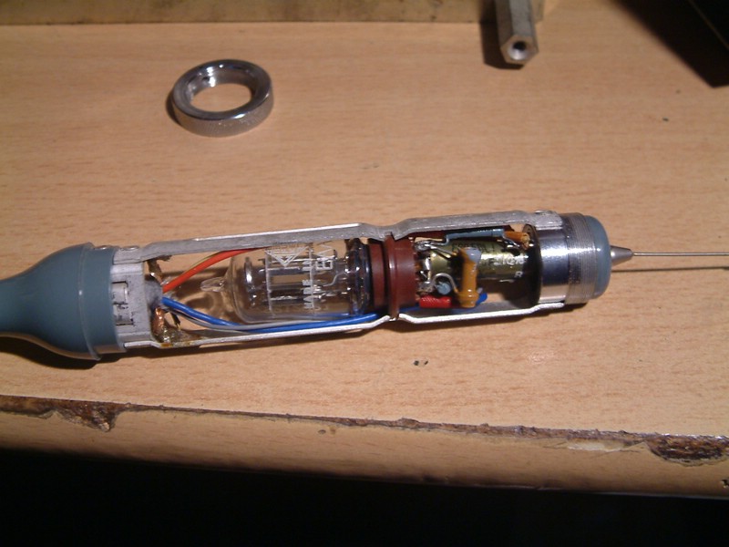 optisch sehr schön gemacht - wie all Deine Arbeiten. Aber ein paar Bedenken habe ich. Eine Abschirmung des Tastkopfes fehlt und der Masseanschluß ist bei 100MHz viel zu lang. Die Verbindung Tastspitze zur Röhre sollte so kurz wie möglich sein und der Masseanschluß auch an der Vorderseite des Tastkopfes sitzen. Idealerweise nimmt man ein Metallrohr als Gehäuse und macht Den Masseanschluß auch vorn neben der Tastspitze ganz außen oder per verschiebarer Schelle auf dem Rohr.