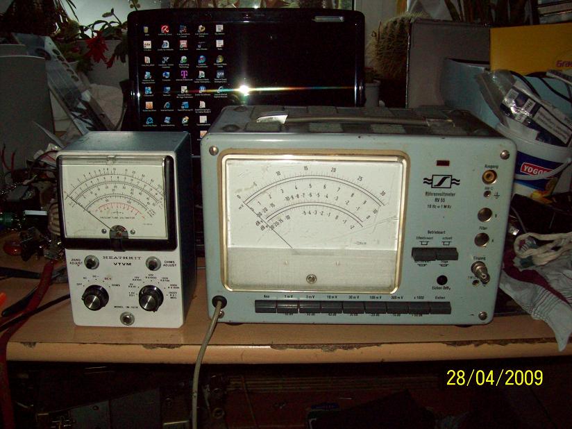 Anbei noch ein Heathkit VTVM Röhrenmultimeter, es kann AC (mit recht weitem Frequenzbereich), DC, ab 1.5V, mA, Ohm. Sehr nett ist der Niederohmbereich mit 10 Ohm Skalenmitte, sowas braucht man recht oft.