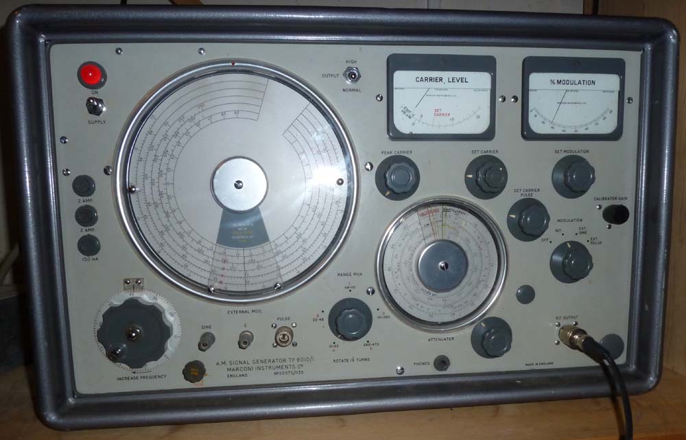 hier die Vorstellung meines Prachtstücks aus der Messgerätesammlung. Es ist der Mess-Sender TF801D vom englischen Hersteller Marconi, Baujahr etwa 1960. Das Gerät bedient den Frequenzbereich von 10..470MHz und kann sowohl amplituden- als auch pulsmoduliert werden. Die Ausgangsspannung kann stufenlos von 100nV..1V verstellt werden, immerhin 140dB. Im Geschäft hatte ich den Spektrum-Analyser zwecks Suche nach Störern ausgeliehen und damit nebenbei die Ausgangsspannung überprüft, und sie stimmt auf 2dB genau über den gesamten Frequenz- und Amplitudenbereich. Das ist eine gewaltige Leistung, vor allem, wenn man bedenkt, dass man damals die Hardwarefehler nicht mit Kalibrierkurven in einem nichtflüchtigen Speicher korrigieren konnte. Die Skalen wurden zwar für jedes Gerät individuell hergestellt (insbesondere die Frequenzskala), aber die Ausgangsspannung musste frequenzunabhängig sein. Glücklicherweise besitze ich auch das Original-Handbuch, da ist nicht nur die Schaltung, Reparaturhinweise und der Abgleich beschrieben, sondern auch alle möglichen Messungen. Daneben enthält es auch diverse Umrechnungstabellen, die in der Taschenrechner-freien Zeit nützlich waren und auch noch sind, wenn gerade kein Taschenrechner in Griffweite liegt.