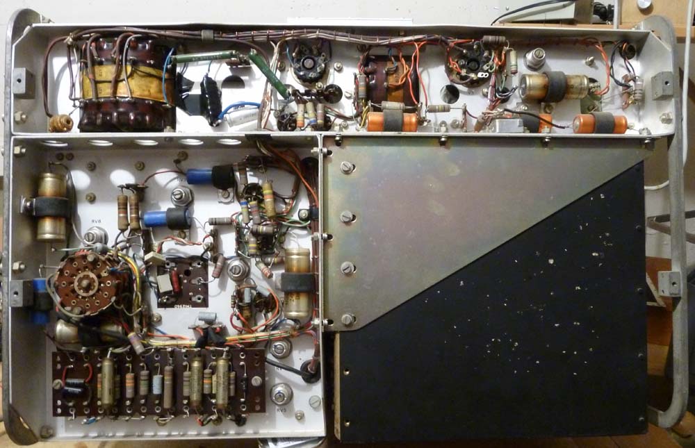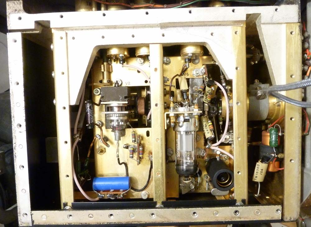 Hier noch ein Blick in den HF-Teil. Man sieht schon die doppelte Abschirmung. Im äusseren Teil ist nur Mechanik und die Verbindung der Durchgangsfilter für die Speisung und die Steuerspannungen. Innen ist links der Oszillator mit der Scheibentriode mit dem Kühlkörper (schwarzer Block oben an der Röhre), und durch den Ausschnitt im Bleck sieht man eine Schwingkreisspule. Rechts ist die Doppel-Tetrode des Puffer-/Endverstärkers, der geregelt und auch moduliert wird. Am Ausgang hat es ebenfalls einen Schwingkreis, dadurch sind die Oberwellen über 60dB gedämpft. Unten im rechten Teil in der schwarzen Metallhülse befindet sich noch eine EF94 als Eichmarkengeber mit einem Quarz, um die Frequenzskala zu kalibrieren.