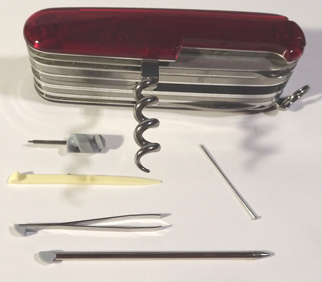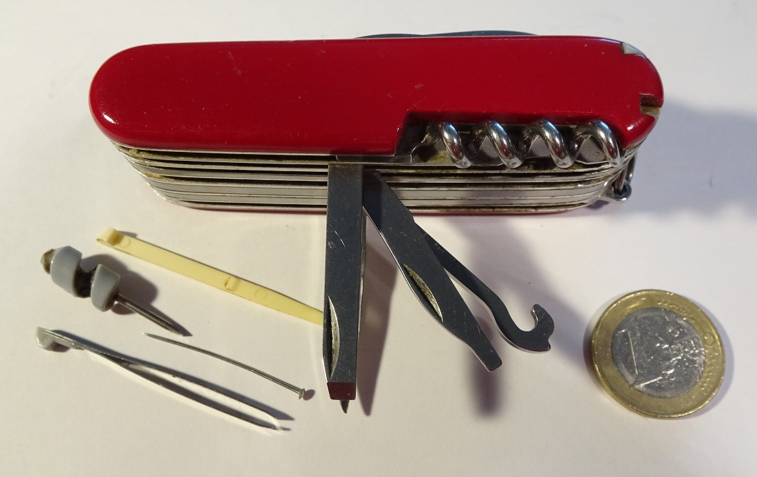 So fing es bei mir an: Den genauen Typ des Victorinox-Messers weiss ich nicht mehr. Ich habe es vor ca. 30 Jahren gekauft. Es hat viele Aufgaben erledigen müssen, auch im Bereich Antennenbau und Amateurfunk-Fielddays. Das Qualitätswerkszeug hat sogar ein Jahr (aus Versehen auf einem Fieldday im Lehmboden verloren) eingegraben überstanden. Nachdem ich es auf dem Timpberg bei Zehdenik wiedergefunden habe, wurde es gereinigt und geölt und versieht seit 1995 wieder brav seinen Dienst bei mir. Eine Schwachstelle ist allerdings die kleine Feder für die Schere: Die mußte ich schon derimal tauschen, ist gerade wieder gebrochen. Das Zubehör, wie die Feder ist relativ umständlich zu beschaffen.