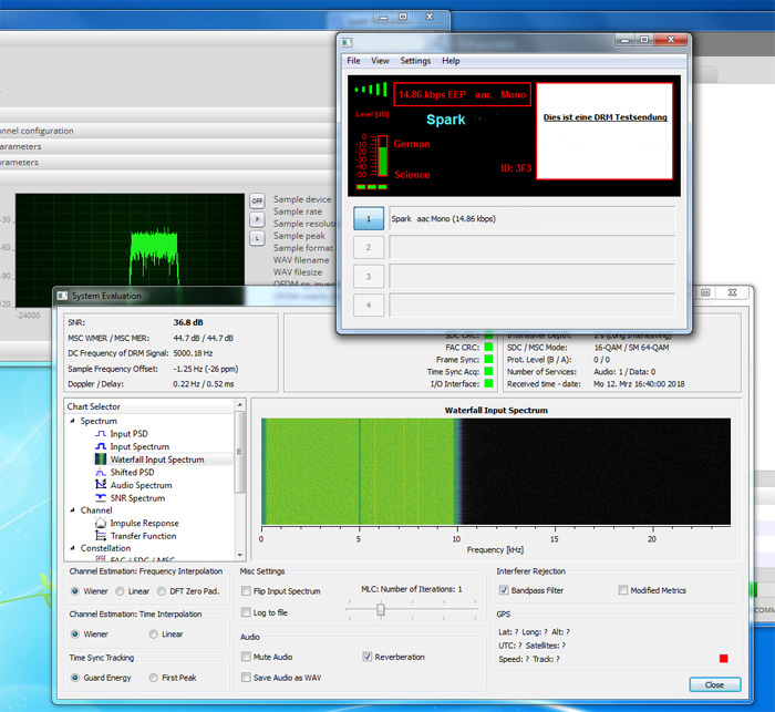 Das erzeugte DRM-Signal wird dann einem SDR (RTLSDR- USB Stick für 5-10 Euro, KW-Direktsampling) zugeführt und mit der Empfangssoftware (hier Dream) dekodiert. Ein normales DRM-Radio ginge natürlich auch.
