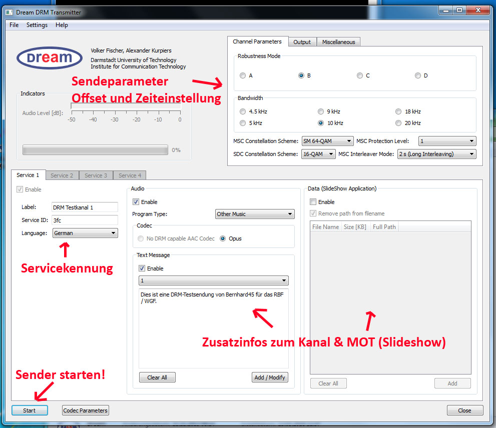 Weniger bekannt ist, das Dream auch in einem Sendemodus gestartet werden kann. Dazu fügt man beim Programmaufruf einfach den Parameter "-t" für Transmit hinzu. Dream sieht dann plötzlich ganz anders aus, nämlich so: