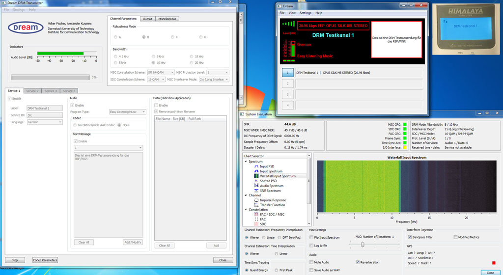 Hat man sich die passenden Sendeparameter zusammengeklickt, kann man den Live-Sendebetrieb über den "Start"-Knopf beginnen. Das über die Soundkarte erzeugte Signal wird wieder mit einem einfachen (aber möglichst frequenzstabilen) HF-Generator auf die Zielsendefrequenz gemischt. Dort kann man das Signal dann mit einem SDR oder DRM-Radio empfangen. Im nächsten Bild, links Dream als Softwaremodulator gestartet, rechts das empfangene Signal mit einer weiteren Dream-Instanz und dem Himalaya 2009 DRM-Radio (nur ID).