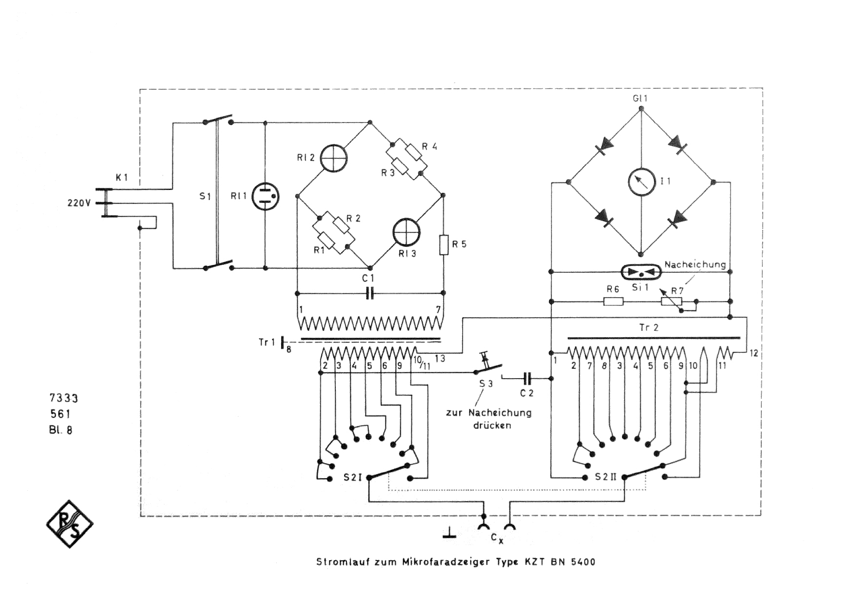Eine Nacheichtaste ermöglicht die Uberprüfung des Mikrofaradzeigers auf einwandfreies Arbeiten. Abweichungen von der Eichmarke können leicht ausgeregelt werden, so daß die Einhaltung der Fehlergrenzen immer gesichert ist.
