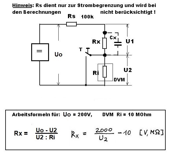 Es wird von dem Umstand Gebrauch gemacht, dass der Eingangswiderstand (Ri) des DVM bei Gleichspannungsmessung 10 MOhm beträgt. Wenn nun das Messobjekt in Reihe mit einer Gleichspannung (Uo) von 200 Volt gelegt wird, dann kann man das als einen Spannungsteiler betrachten. Es wird die Spannung (U2) gemessen und der Rx mit der angegebenen (einfachen) Formel berechnet.