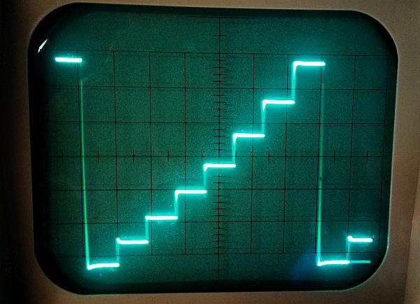 vor einigen Wochen bereits ist das fehlende Bauteil eingetroffen und jetzt habe ich es eingebaut. Das Treppensignal für die Ansteuerung der Basis oder des Gates ist jetzt auch vorhanden: