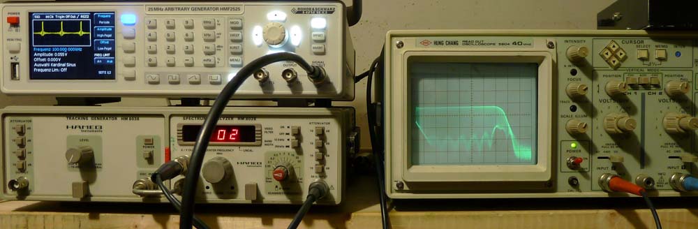 Der Amplitudenfehler beträgt gemäss Datenblatt maximal 3dB, was etwa der Tatsache entspricht, wobei mein Tracking-Generator eine praktisch frequenzunabhängige Amplitude liefert, während der Spektrum-Analyser bei hohen Frequenzen etwas Abfall zeigt. Wenn man das Alter von mittlerweile 30 Jahren ohne Nach-Abgleich bedenkt, ist das ein guter Wert.