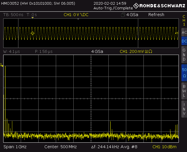 Es gibt nur wenige Oberwellen mit niedrigem Pegel, daneben ist noch das Steuersignal und der Lokaloszillator etwas über 600MHz zu sehen.