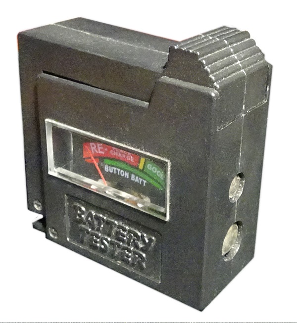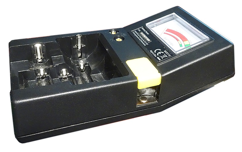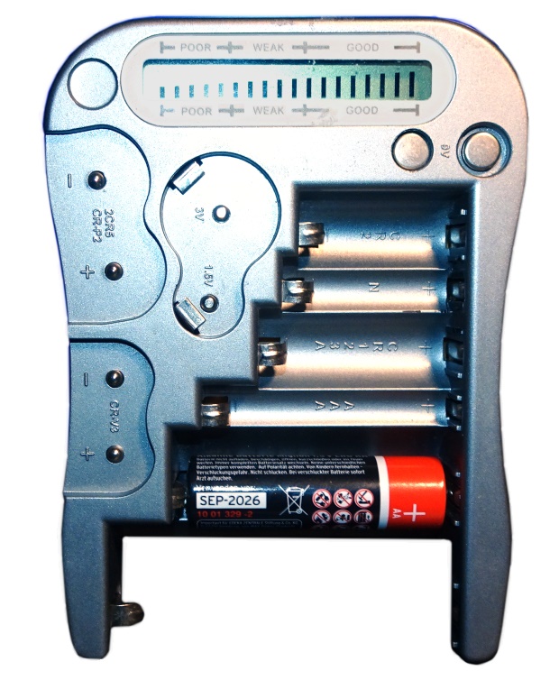 ein weiterer Batterie-Tester, der wohl auch von Hama, Dlyfull und anderen angeboten wurde. Er hat eine AAA-Versorgungsbatterie. Es können die klassischen Batterieformen, 9 Volt und auch verschiedene Knopfzellen geprüft werden. Die Anzeige ist als LCD-Balken-Reihe und Bereich-Bezeichnungen ausgebildet: Good, weak, poor.