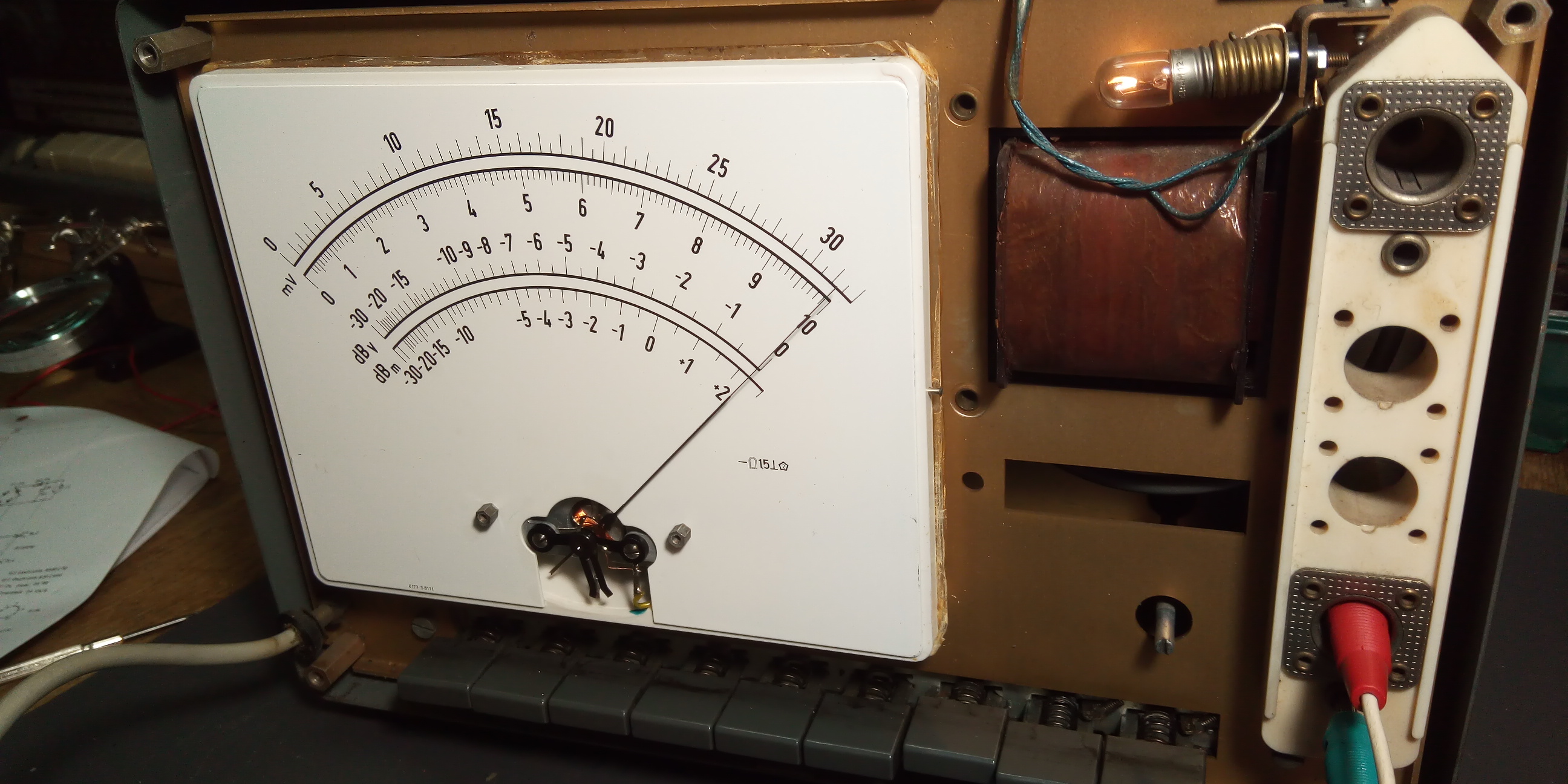 Es musste ein mechanischer Fehler im Drehspulinstrument sein, der für das Haken sorgt. Ich demontierte das Skalenglas ab. Es ist mit vier winzigen Stiften befestigt, die jeweils mittig an den vier Seiten des Drehspulinstruments sitzen. Diese Stifte lassen sich abziehen. Ein Vorbesitzer hatte dies nicht erkannt und dabei offensichtlich Gewalt angewendet und den Riss im Skalenglas erzeugt. Nach dem ich die Mechanik der Drehspule mit Tunerspray (Kontakt PRF 7-87 von Taerosol, erzeugt einen schmierenden Ölfilm) einsprühte, war der Fehler verschwunden. Bei so einer feinen Mechanik würde ich jedenfalls nur speziellle Sprays für Tuner und Videogeräte nehmen, nicht irgendeinen "Rostlöser".