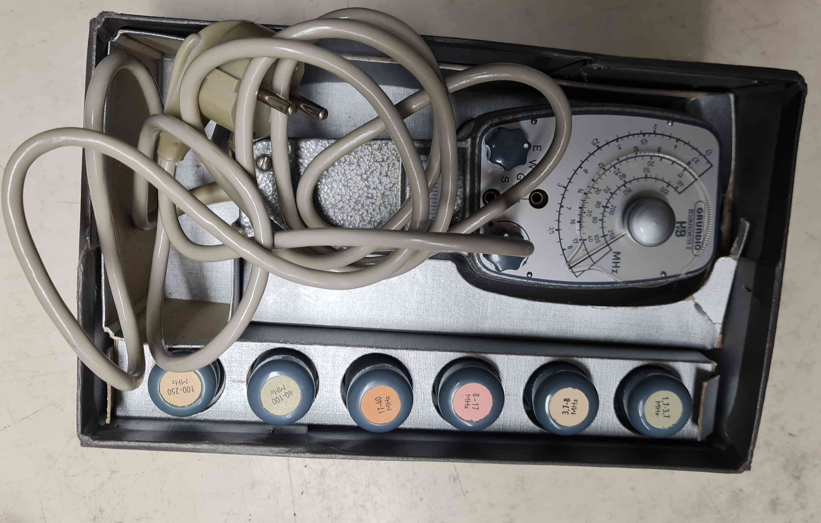 Das verwendete Gerät Grundig TR 300 hat keinen HF-Ausgang. So muss man, wie im Video im Hintergrund zu sehen ist, den Dipmeter mit der Frequenz des ermittelten Dip über eine nicht resonante schwach gekoppelte Mess-Sonde parallel an einen Frequenzmesser oder den Oszi geben. Interessant ist, dass die Sonde hier die resonante Spule detektiert, nicht den Dipmeter, der zu schwach sendet.