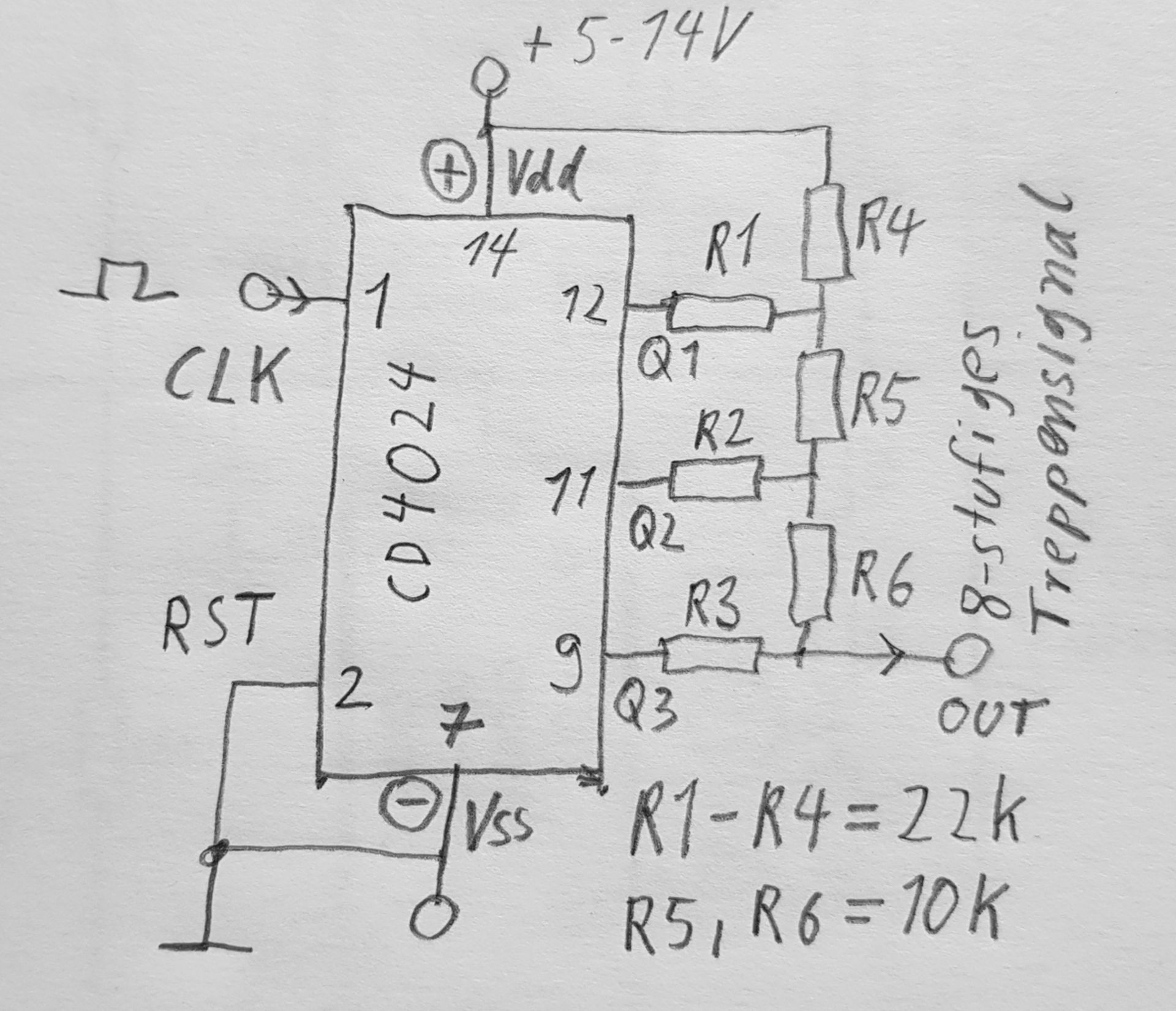 5. An Stelle des CD4040 nehme ich einen CD4024, weil ich davon mehrere bereits habe. Mit einer etwas anderen Beschaltung erzeugt er ebenfalls ein 8-stufiges Treppensignal.