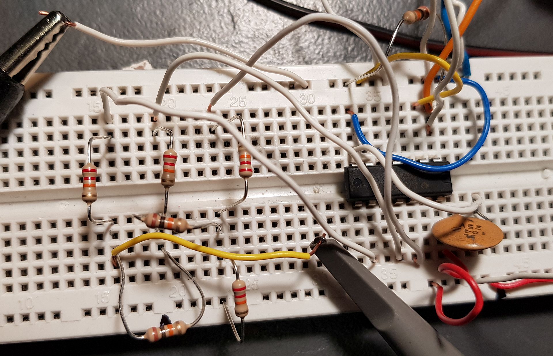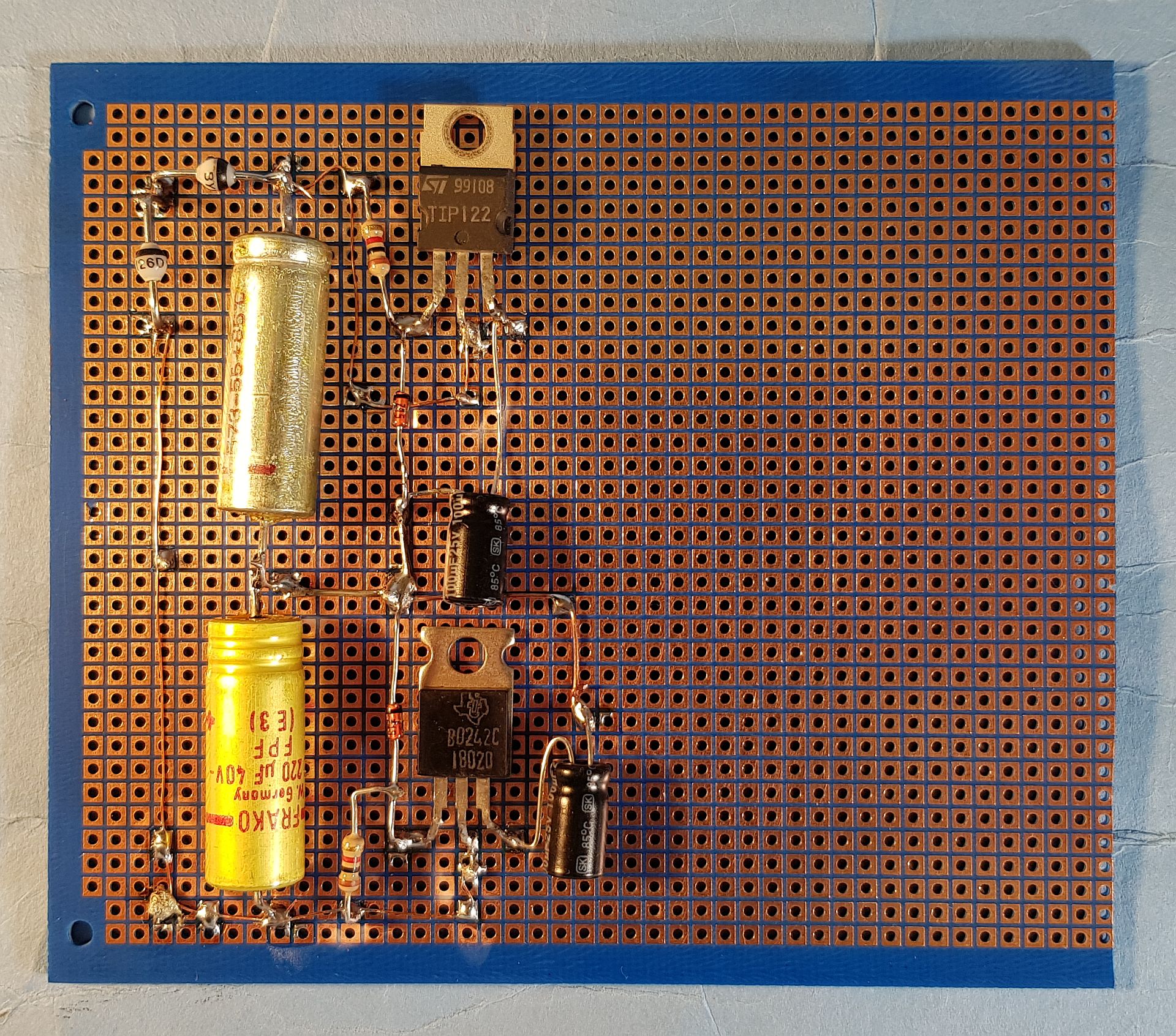 Auf die Locherrasterplatte versuche ich die restliche Schaltung unterzubringen. Der Generator für das Treppenstufensignal und die Schirmgitterspannungsversorgungen kommen auf eine weitere Lochrasterplatte.