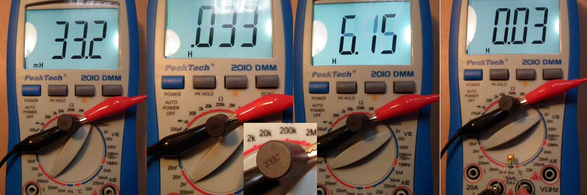 Bei erneuten Vergleichsmessungen von Lx einiger Prüflinge habe ich wie schon beim ersten Gerät festgestellt, dass es entweder sehr genau misst oder richtig Blödsinn anzeigt. Blödsinnige Werte gehen meist mit unstabiler Anzeige, manchmal auch negativen Werten (minus!) einher und treten scheinbar nur in den Bereichen 2 und 20H auf. Durch Zufall, beim Berühren meiner Messobjekte mit den Fingern, habe ich entdeckt, was man dagegen machen kann. Meine Theorie zu dieser Entdeckung: Ein schlecht kompensierter Messverstärker - wilde Schwingungen. An den Kabeln liegt es nicht. Das Phänomen ist auch nicht durch kurze oder keine Messkabel vermeidbar. Auch wenn man die Prüflinge direkt in die Buchsen des Gerätes oder in die mitgelieferte Steckvorrichung steckt, spinnt das 2010 bei den Bereichen 2 und 20H. Was hilft ist, die Finger oder 1nF mit an den Eingang zu legen.