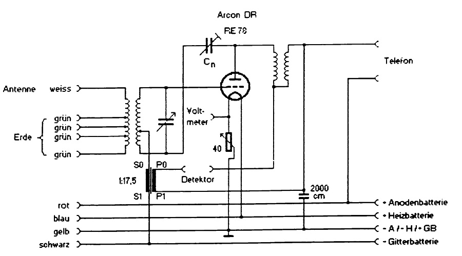 Die meisten Besitzer von Detektor-Empfangsanlagen empfanden es als unangenehm, nur Kopfhörer verwenden zu können. Alle waren sich aber einig, daß die Verwendung des Detektors eine klangreine Wiedergabe von Musik und Sprache bietet. Ihr Wunsch war daher Lautsprecherempfang mit einem Detektorempfänger. Mit dem „Telefunkon N“, das neben dem Detektor nur eine Röhre und zwar eine der Sparröhren (Thoriumröhre RE 83 oder Oxydfadenröhre RE 84) benutzte und diese gleichzeitig in Hochfrequenz- und Niederfrequenzschaltung (Reflexschaltung) verwendete, gab es eine Lösung für das Problem. Diese Reflexschaltung hatte den Vorteil, mit geringem finanziellen Aufwand einmal eine gesteigerte Empfangsempfindlichkeit des Detektorgerätes und zweitens die Anwendbarkeit eines Lautsprechers in den Sendestädten selbst und deren naher Umgebung bei guter Antenne zu gewährleisten. Zum Anschluß eines zweiten Niederfrequenz- verstärkers war das Gerät aber nicht geeignet. Der Wellenbereich von 250 bis 700 m entsprach den Auflagen der damaligen Postverwaltung. Rein äußerlich betrachtet, besteht das „Telefunkon N“ aus einem schwarz polierten Kasten, der auf seiner Vorderseite in zwei Reihen je 6 Klemmen trägt. In der Mitte befindet sich die Röhrenfassung mit dem Regulierwiderstand für die Heizspannung und dem darunter gelegenen Abstimmknopf. Die Bestimmung der Klemmenanschlüsse geht in genügender Klarheit aus nebenstehender Abbildung hervor. Um auch die Thoriumröhre RE 78 oder die Wolframröhre RE 11 verwenden zu können, ist ein grober Vorschaltwiderstand in das Gerät eingebaut, dessen gänzliches Ein- und Ausschalten zwei volle Umdrehungen seines Griffes erfordert. Zur Heizung muß bei den Thoriumröhren RE 78 und RE 83 ein 4 Volt-Akkumulator oder eine 4,5 Volt-Trockenbatterie angeschlossen werden. Für die Oxydfadenröhren (RE 84) genügt ein 2 Volt-Akkumulator oder eine 3 Volt-Trockenbatterie. Als Anodenbatterie wurde die Telefunken-Trockenbatterie HB 418 mit den entsprechenden Anzapfungen für die Anoden- und Gitterspannung empfohlen. „Bei der Einstellung des Gerätes auf den gewünschten Empfang ist folgendes zu beachten: Vorausgesetzt wird, daß die Schaltung richtig ist, die benutzte Anodenspannung der angegebenen Röhrenspannung entspricht, die Batterie die vorgeschriebene Spannung zeigt und der Detektor Kontakt besitzt. Unter Benutzung des Kopfhörers dreht man den Heizreglerknopf im Sinne des Uhrzeigers soweit, bis die Röhre zum Glühen gelangt – und zwar bei Wolframröhren bis zur Weißglut, bei Oxydfadenröhren bis zur schwachen Rotglut und bei Thoriumröhren nur bis zur schwachen Gelbglut (bei letzteren erkennt man trotz der Verspiegelung des Glaskolbens den Glühgrad an der Spitze der Röhre). Man beläßt die Heizung auf dem Punkt, bei dem schon ein geringes Rückwärtsdrehen des Heizreglers ein starkes Abfallen der Lautstärke veranlaßt, während ein weiteres Vorwärtsdrehen keinen merklichen Zuwachs an Lautstärke bringt. (Stärkere Heizung führt lediglich zur raschen Zerstörung der Röhren.) Dann sucht man mit dem Abstimmgriff den gewünschten Sender und, wenn nötig, eine günstigere Kontaktstelle des Detektors. Beim Suchen des Senders empfiehlt es sich, für den Fall, daß man an eine der Skalen-Endstellungen kommt, die bisher an der mittleren Antennenklemme liegende Antenne entweder an die obere oder die untere Antennenklemme zu legen, wodurch die Abstimmung mehr nach der Skalenmitte verlegt wird. Eine Empfangsverbesserung kann dann noch durch Änderung von Anoden- und Gitterspannung versucht werden. Man erzielt beim Erhöhen der Gittervorspannung eine größere Reinheit der Tonwiedergabe. Im Interesse der Röhrenlebensdauer soll man stets auf möglichst niedrige Heiz- und Anodenspannung bedacht sein. Werden diese leicht zu befolgenden Vorschriften genügend beobachtet, wird das Gerät im Rahmen seiner Leistungsfähigkeit jedem Besitzer ungetrübte Freude und Genuß am Rundfunk bereiten.“ (TELEFUNKEN-RUNDSCHAU, Nr. 7/8, Dezember 1924)