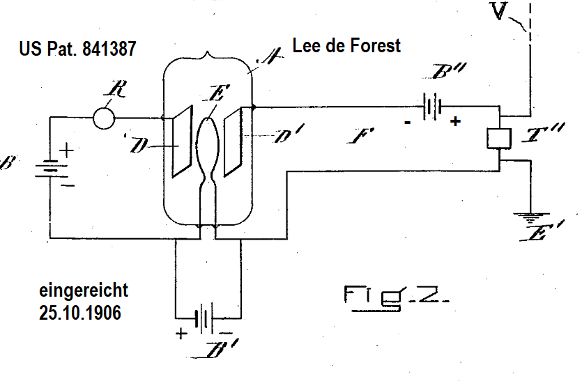 Schon 1906 meldete De Forest eine zweite Platte als Steuerelektrode zur Verstärkung an (Pat. US841387).