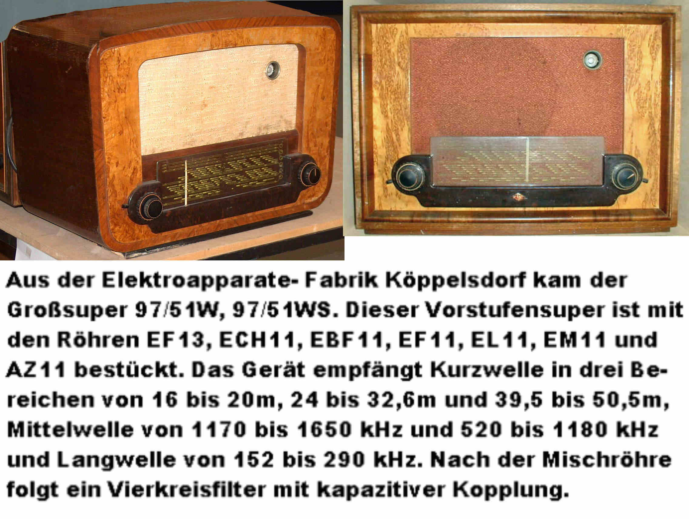 1945 / 46: Einkreiser mit dreimal RV12P2000 1947: Super 5/47W mit ACH1, AF3, ABC1, AL4 und AZ11 1947: Einkreiser mit AF7, AL4, AZ1 1950: Spitzensuper914/50 mit 14 Oktalröhren 1950: Zwergsuper64/50 mit UCH11, UBF11 und UCL11 1951: Großsuper 97/51WS mit EF13, ECH11, EBF11, EF11, EL11, EM11 und ein Selengleichrichter.